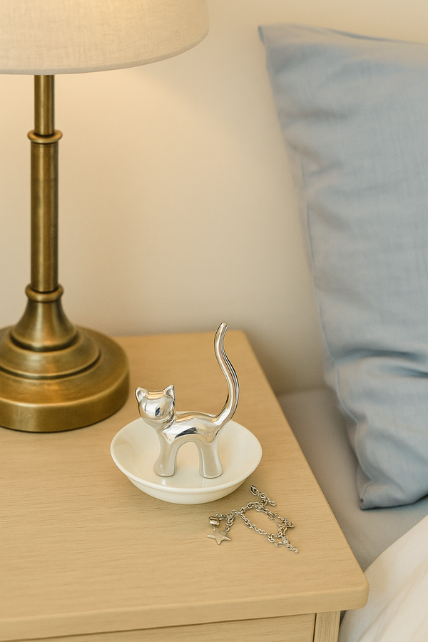 This charming cat dish adds a touch of grace to your space while keeping your favourite pieces within easy reach.
